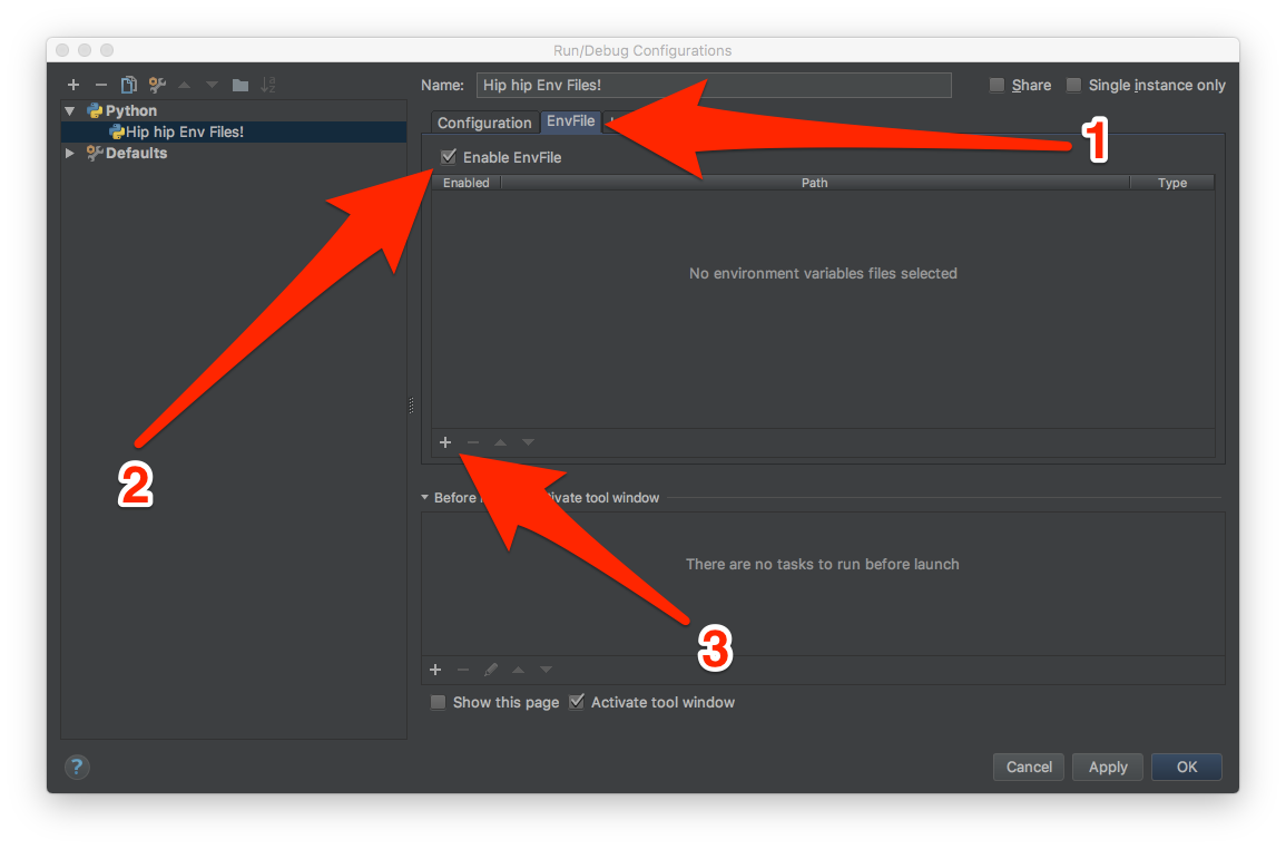 j'ai pu comprendre cela en utilisant un plugin PyCharm appelé EnvFile . Ce plugin, permet essentiellement de définir des variables d'environnement pour exécuter des configurations à partir d'un ou plusieurs fichiers.